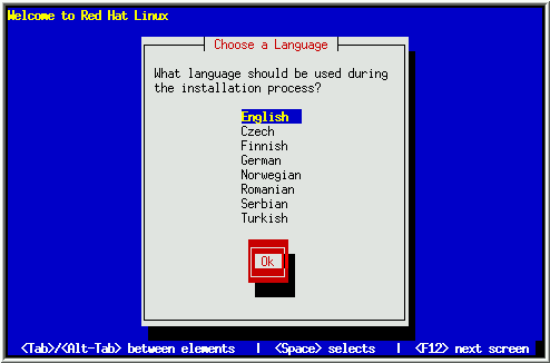 After the welcome dialog, the installation program asks you to select the language to be used during the installation process (see Figure 6). Using the [\uparrow] and [\downarrow] keys, select the appropriate language. A scroll bar may appear to the right of the languages -- if present, it indicates that there are more entries than can be displayed at one time. You'll be seeing scroll bars like this throughout the installation program.