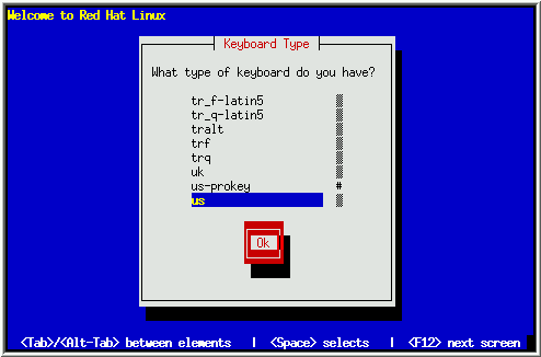After selecting the appropriate keyboard type, press [Enter]; the keyboard type you select will be loaded automatically both for the remainder of the installation process and each time you boot your Red Hat Linux system. If you wish to change your keyboard type after you have booted your Red Hat Linux system, you may use the /usr/sbin/kbdconfig command.