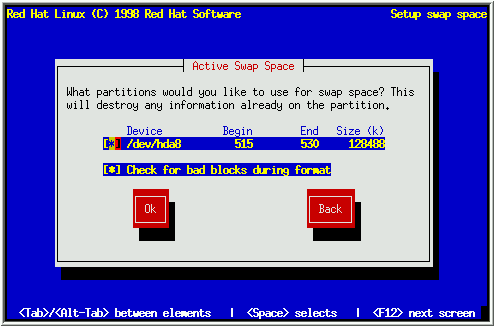 After you've created partitions for Red Hat Linux, the installation program looks for swap partitions (see Figure 25). If it finds any, it asks whether you want to initialize them. Select the partition(s) you wish to initialize as swap space using [Space]; if you wish to check the partitions for bad blocks, make sure the Check for bad blocks during format box is checked. Choose OK, and press [Space].
