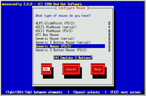 The installation program's ``best guess'' as to your system's mouse type will be highlighted. If the mouse type is not accurate, use the [\uparrow] and [\downarrow] keys to scroll through the different mouse types. In general, you should use the following approach to selecting your system's mouse type:
