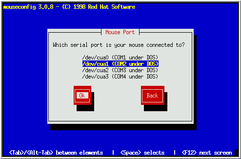 If you've selected a mouse with a serial interface, you will then see a screen similar to the one shown in Figure 34. Simply highlight the appropriate serial port for your mouse, select Ok, and press [Space].