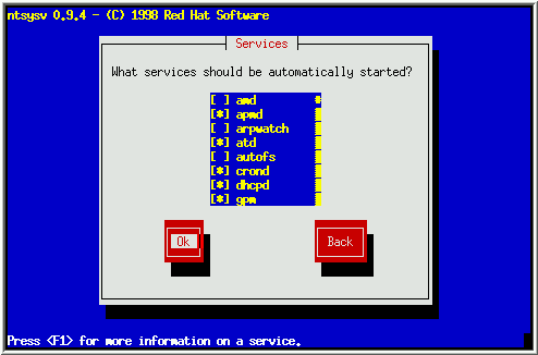 Next you'll see a dialog box entitled ``Services'' (see Figure 37). Displayed in this box is a list of services with a check box by each. Scroll through this list, and check every service that you would like automatically started every time your Red Hat Linux system boots. If you're not sure what a particular service is, move the highlight to it and press [F1]. You'll then get a brief description of the service.