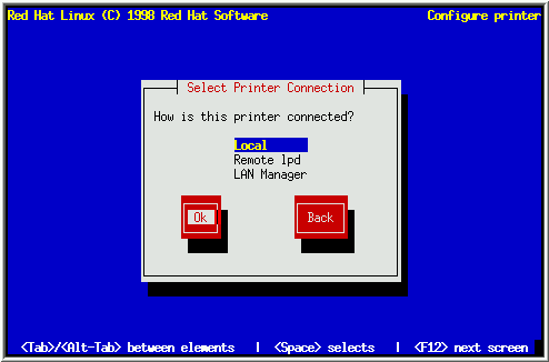 After you have set up networking, the installation program asks whether you would like to configure a printer. If you choose Yes, a dialog box will ask you to indicate how the printer is connected to your computer (see Figure 38).