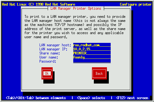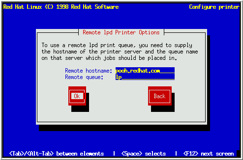 Enter the name of the computer to which the printer is directly connected in the ``Remote hostname'' field. The name of the queue on the remote computer that is associated with the remote printer goes in the ``remote queue'' field. Select Next, and press [Space]. Now turn to Section 5.6.4 to continue.