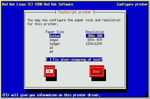 After selecting the printer type, you will see a dialog box similar to the one in Figure 44. Set the paper size and resolution appropriately. The Fix stair-stepping of text check box should be checked if your printer does not automatically perform a carriage return after each line.