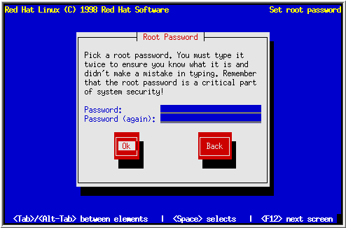 You ought to make the root password something you can remember, but not something that is easy for someone else to guess. Your name, your phone number, qwerty, password, root, 123456, and anteater are all examples of poor passwords. Good passwords mix numerals with upper and lower case letters and do not contain dictionary words: Aard387vark or 420BMttNT, for example. Remember that the password is case-sensitive. Write down this password and keep it in a secure place.