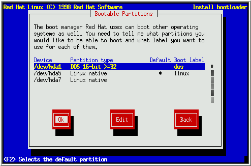 There is also a column labeled ``Default''. Only one partition will contain an asterisk under that column. The partition marked as the default will be the partition LILO will boot if there is no user input during the boot process. Initially the root partition for your Red Hat Linux installation will be selected as the default. If you'd like to change this, use the arrow keys to highlight the partition you'd like to make the default, and press [F2]. The asterisk should move to the selected partition. When you've finished, select Ok, and press [Space].