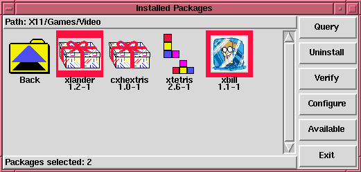 To select a single package, click the left mouse button on it. You'll notice a thin border appear around the package's icon (as shown in figure 101) which shows that it's currently selected. To unselect it, click the left mouse button on it and the border will disappear. The number of packages currently selected is always displayed at the bottom of the window. A group's folder icon displays the number of packages within that group that have been selected, or All if all have been selected.