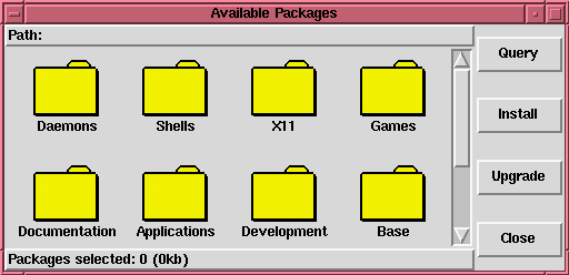 To view the packages and subgroups within a group, double click the left mouse button on a group's folder icon. The window then changes to show what that package contains. The top line of the package display shows which group you're currently looking in, as well as the groups leading to the current one. To return to the previous group you were looking at, double click on the ``Back'' folder, which is always in the upper left hand corner of the folder area (though it often gets scrolled away).