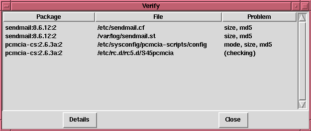 The three columns in this window describe the package with a problem in it, the file that has the problem, and a brief description of the discrepancies that were found. While the check is running, the current file being checked appears as the last element in the list, and the problem is listed as (checking). A full list of the problems that can be found through verification appears in figure 107.