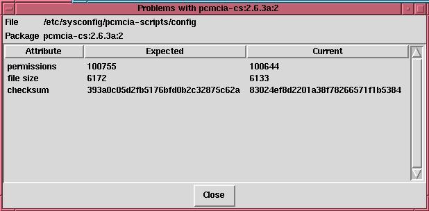To get more information on the problems found with a file, double click on the file's path. A window like the one shown in figure 108 lists the expected and current values of the attributes that are amiss.