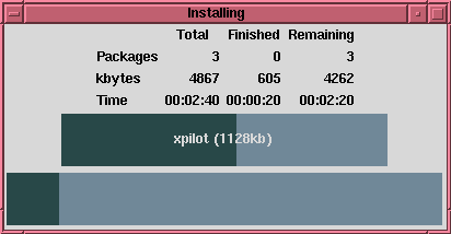 After you've begun the installation, a window appears like the one in figure 110. It tracks the progress of the installation so you'll know something is happening. The top bar shows how much of the current package (whose name is listed inside of it) has been installed while the bottom graph shows how much of the total installation has been finished. The number of packages, package sizes, and time estimates are continually updated.