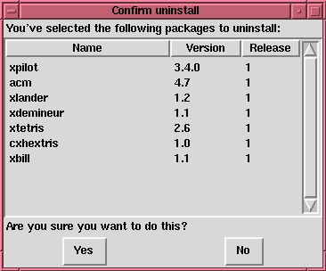 Once you've begun the uninstall, glint asks for confirmation, showing a window like the one in figure 111. All of the packages that are about to be uninstalled are listed. You should look at them all to ensure you're not about to remove something you want to keep. Clicking the Yes button will start the uninstallation process. After it completes, the packages and groups that have been removed will disappear from any windows they were in.